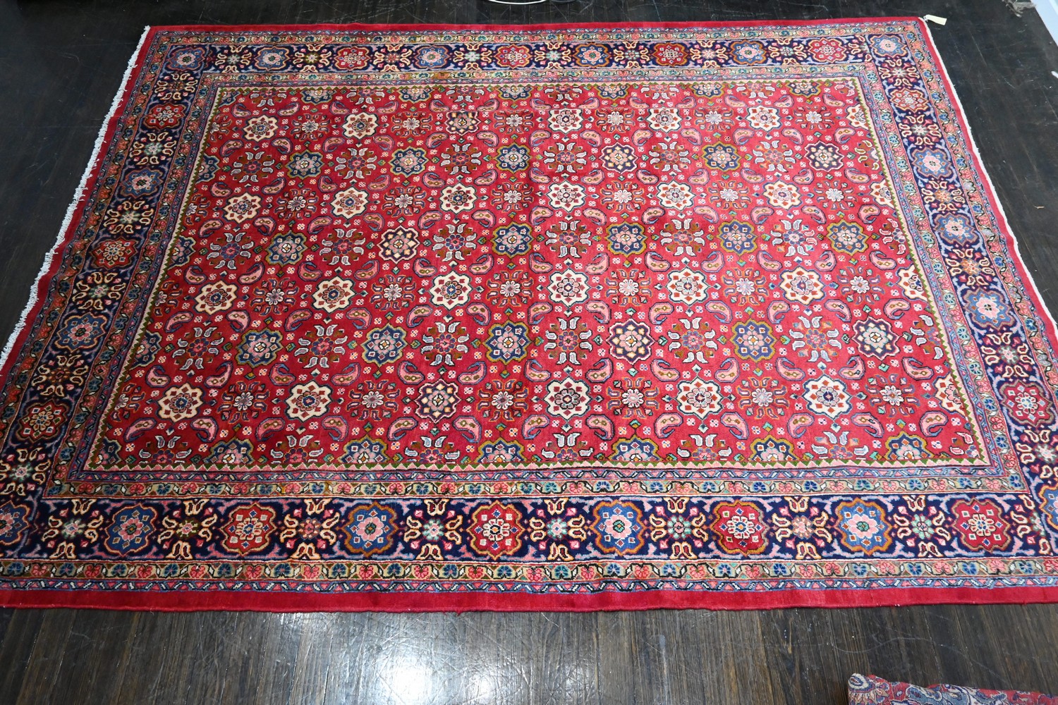 A VERY FINE PERSIAN RUG IN RED TONES WITH GEOMETRIC DESIGN IN A NAVY BLUE BORDER (431 X 310 CM) (PLEASE NOTE THIS HEAVY ITEM MUST BE REMOVED BY CLIENTS OR CARRIERS AT THE CUSTOMERS EXPENSE. LEONARD JOEL STAFF CANNOT ASSIST CARRYING THIS ITEM)