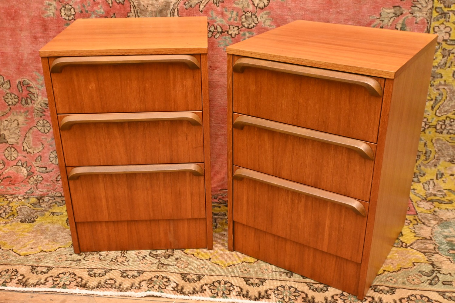 A PAIR OF RETRO THREE DRAWER BEDSIDES (A/F) ( 66H X 45W X 47D CM) (LEONARD JOEL DELIVERY SIZE: LARGE)