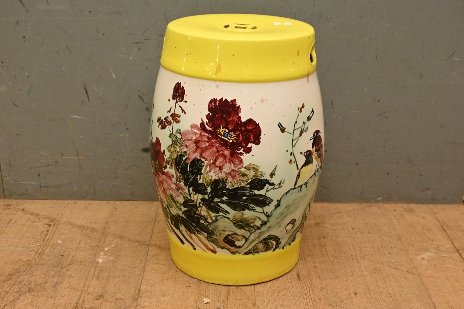 A CHINESE CERAMIC DRUM STOOL (A/F) ( 47H X 35 DIAMETER CM) (LEONARD JOEL DELIVERY SIZE: LARGE)