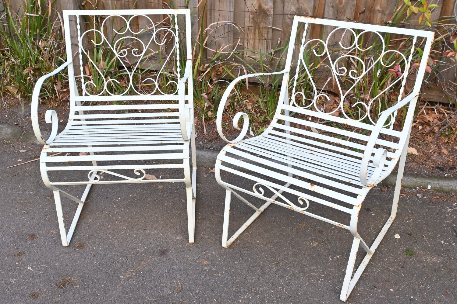 A PAIR OF METAL OUTDOOR CHAIRS (A/F) (78H X 52D X 50D CM) (LEONARD JOEL DELIVERY SIZE: LARGE)