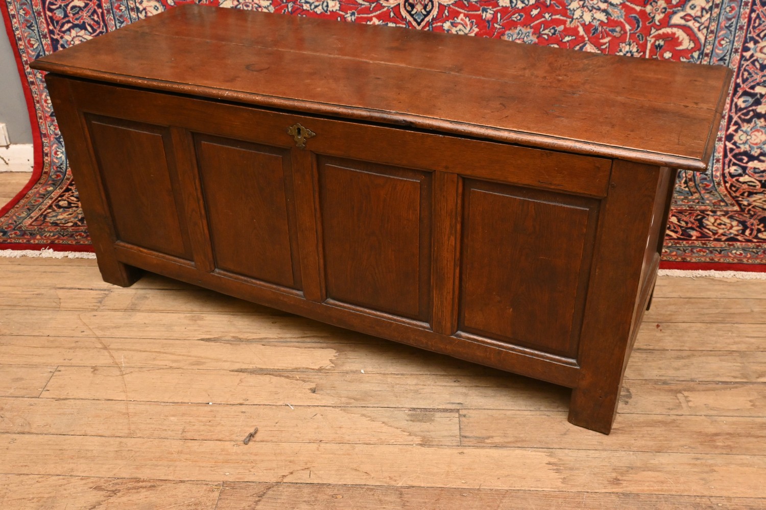 AN EARLY GEORGIAN OAK COFFER, WITH ORIGINAL TILL TO THE INTERIOR ( 62H X 146W X 56D CM) (PLEASE NOTE THIS HEAVY ITEM MUST BE REMOVED BY CLIENTS OR CARRIERS AT THE CUSTOMERS EXPENSE. LEONARD JOEL STAFF CANNOT ASSIST CARRYING THIS ITEM)