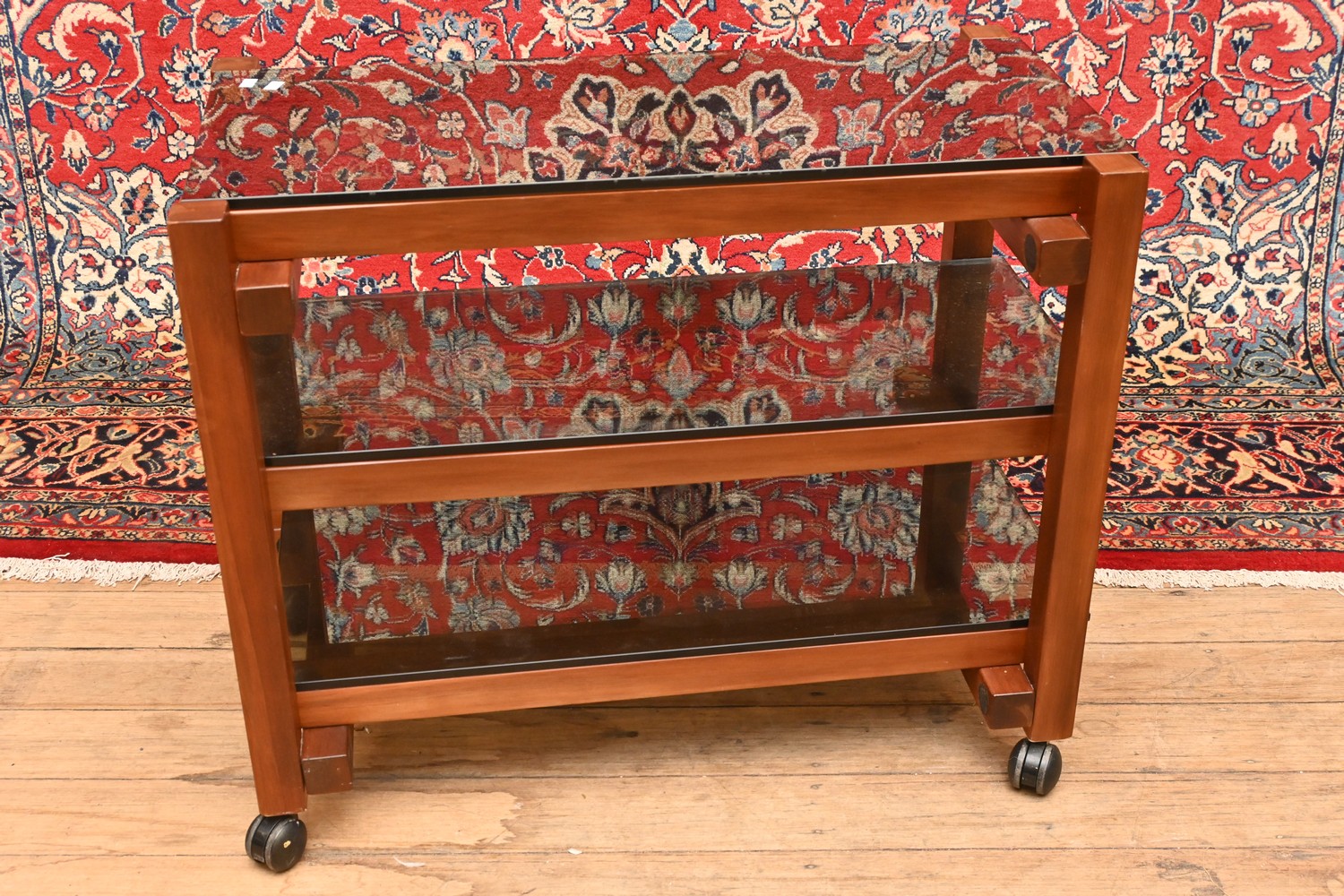 A THREE TIER GLASS AUTO TROLLEY ( 64H X 77W X 41D CM) (PLEASE NOTE THIS HEAVY ITEM MUST BE REMOVED BY CLIENTS OR CARRIERS AT THE CUSTOMERS EXPENSE. LEONARD JOEL STAFF CANNOT ASSIST CARRYING THIS ITEM)