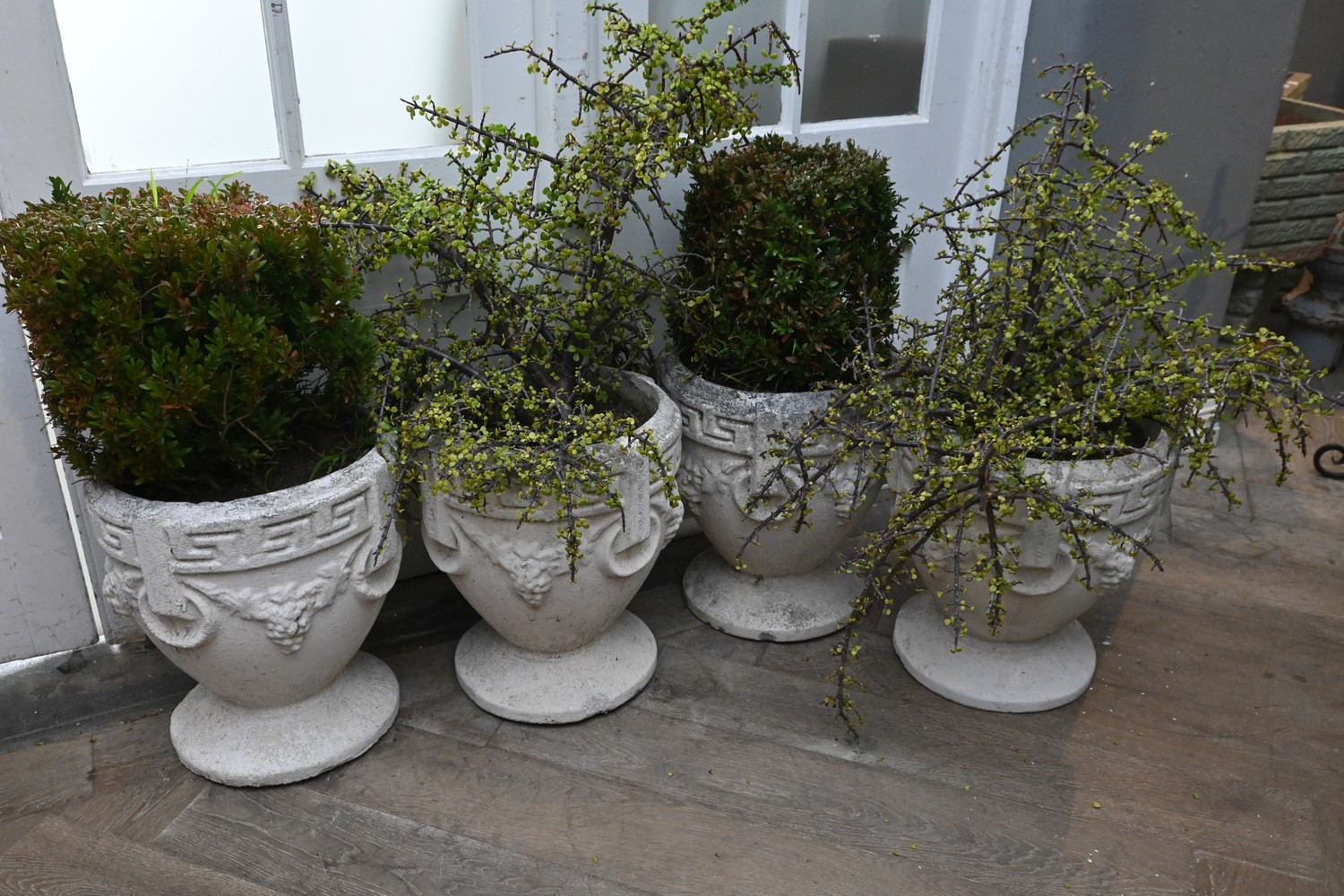 A COLLECTION OF FOUR CONCRETE GARDEN POTS WITH GREEK KEY DESIGN (A/F) ( 90H X 40 DIAMETER CM) (PLEASE NOTE THIS HEAVY ITEM MUST BE REMOVED BY CLIENTS OR CARRIERS AT THE CUSTOMERS EXPENSE. LEONARD JOEL STAFF CANNOT ASSIST CARRYING THIS ITEM)