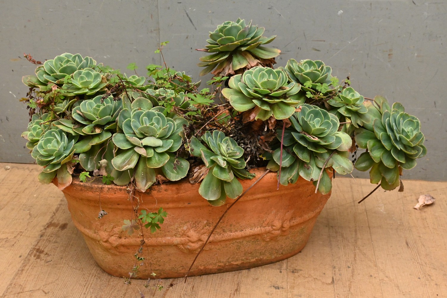 A TERRACOTTA PLANTER WITH PLANT (A/F) ( 50H X 90W X 50D CM) (PLEASE NOTE THIS HEAVY ITEM MUST BE REMOVED BY CLIENTS OR CARRIERS AT THE CUSTOMERS EXPENSE. LEONARD JOEL STAFF CANNOT ASSIST CARRYING THIS ITEM)