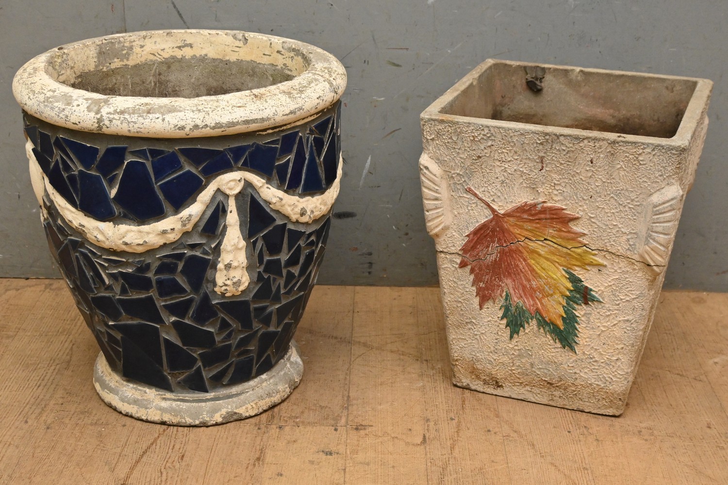 TWO VINTAGE CONCRETE PLANTERS ( A/F) ( 50H X 46 DIAMETER CM) (PLEASE NOTE THIS HEAVY ITEM MUST BE REMOVED BY CLIENTS OR CARRIERS AT THE CUSTOMERS EXPENSE. LEONARD JOEL STAFF CANNOT ASSIST CARRYING THIS ITEM)