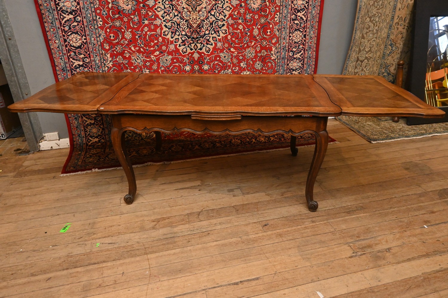 A FRENCH OAK PARQUETRY TOP EXTENSION TABLE ( A/F) ( 76H X 266W X 100D CM) (PLEASE NOTE THIS HEAVY ITEM MUST BE REMOVED BY CLIENTS OR CARRIERS AT THE CUSTOMERS EXPENSE. LEONARD JOEL STAFF CANNOT ASSIST CARRYING THIS ITEM)