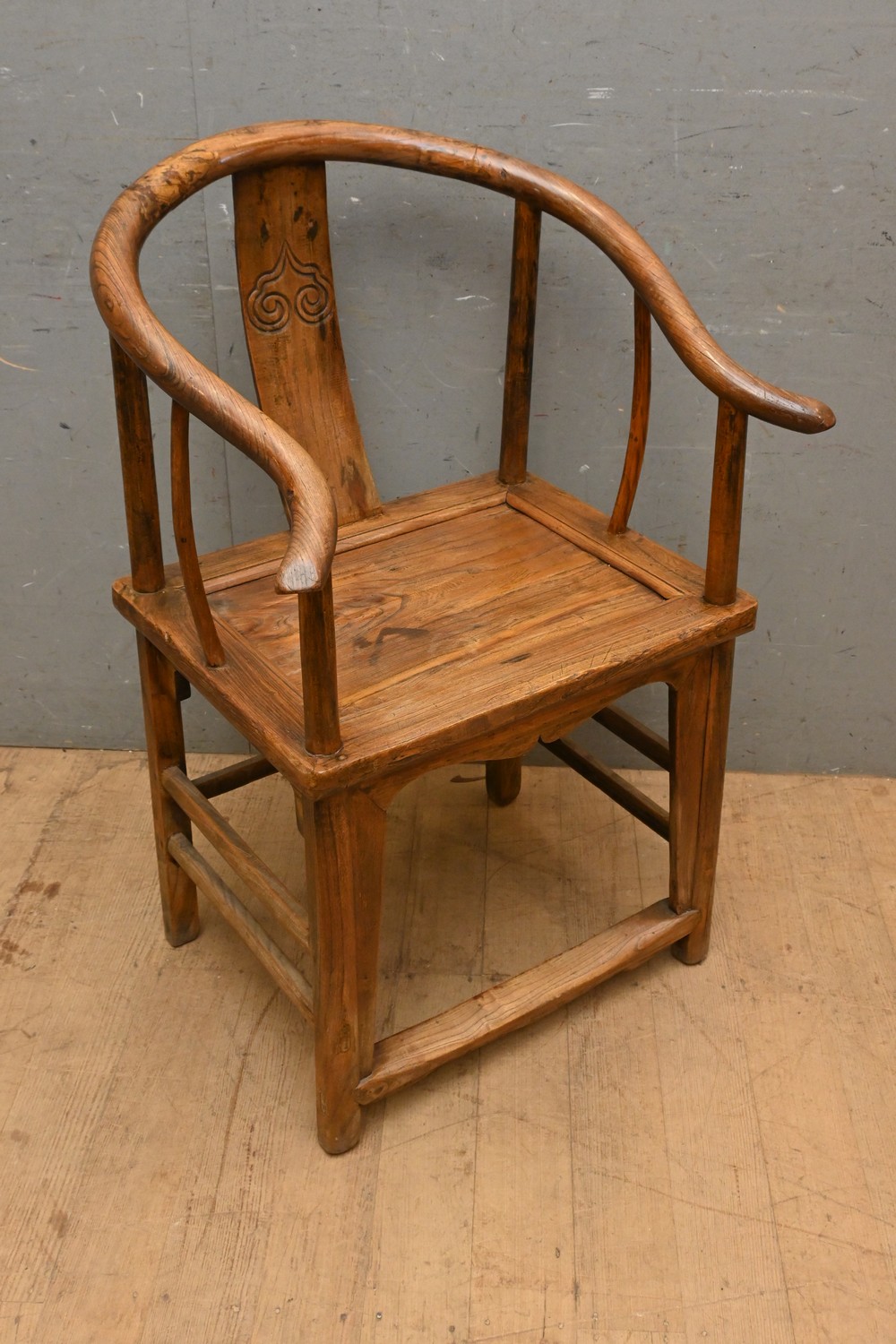 AN ANTIQUE CHINESE ELM HORSESHOE SHAPED CHAIR ( 98H X 63W X 63D CM) (LEONARD JOEL DELIVERY SIZE: LARGE)