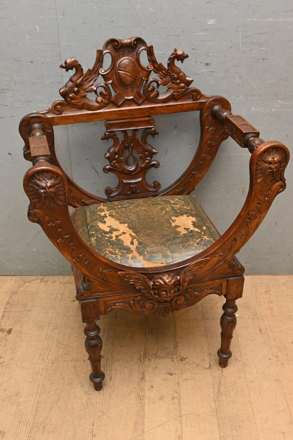 A TIMBER CARVED ARMCHAIR (A/F) ( 96H X 67W X 45D CM) (LEONARD JOEL DELIVERY SIZE: LARGE)