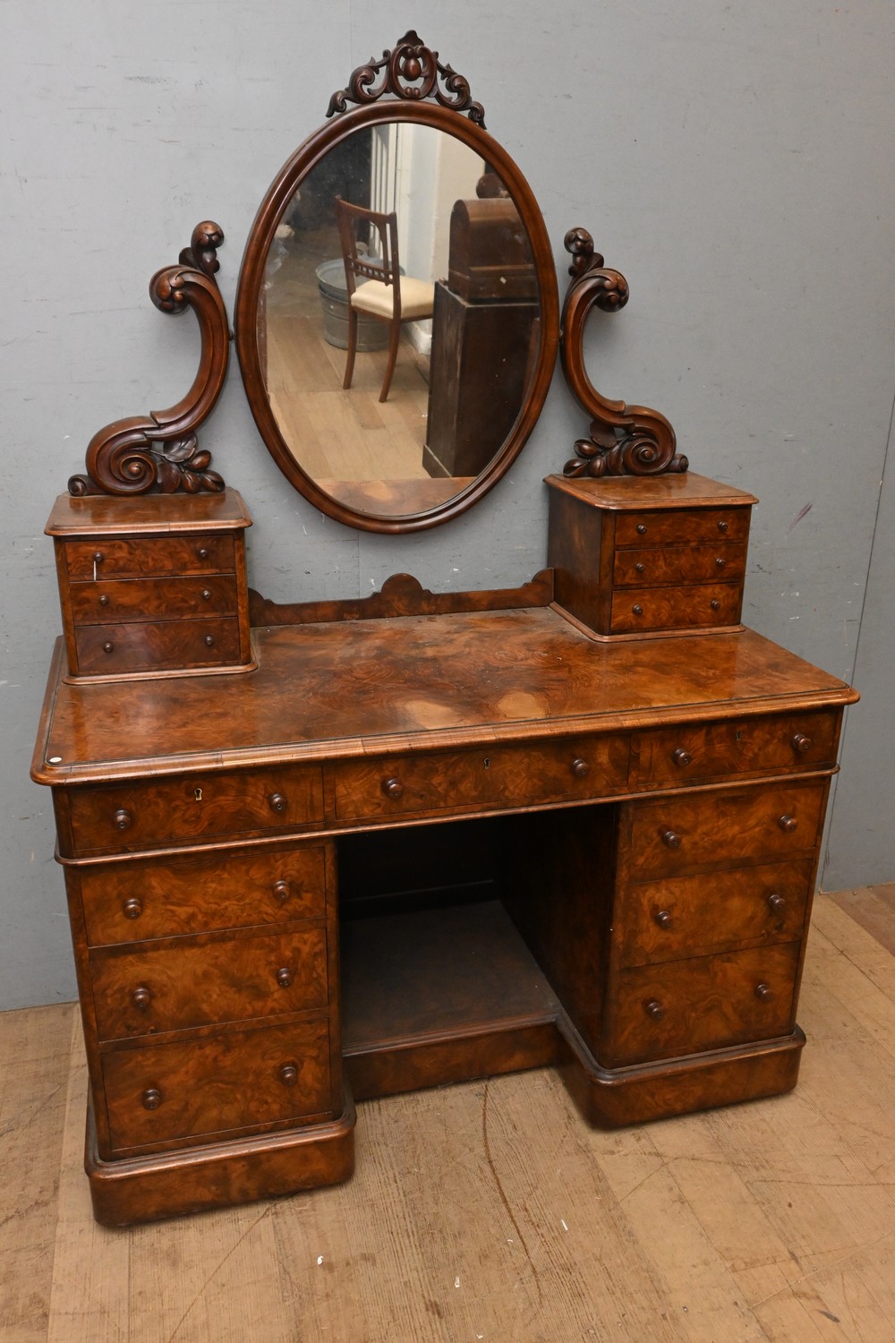 A VICTORIAN BURR WALNUT DRESSING TABLE ( 173H X 124W X 62D CM) (PLEASE NOTE THIS HEAVY ITEM MUST BE REMOVED BY CLIENTS OR CARRIERS AT THE CUSTOMERS EXPENSE. LEONARD JOEL STAFF CANNOT ASSIST CARRYING THIS ITEM)