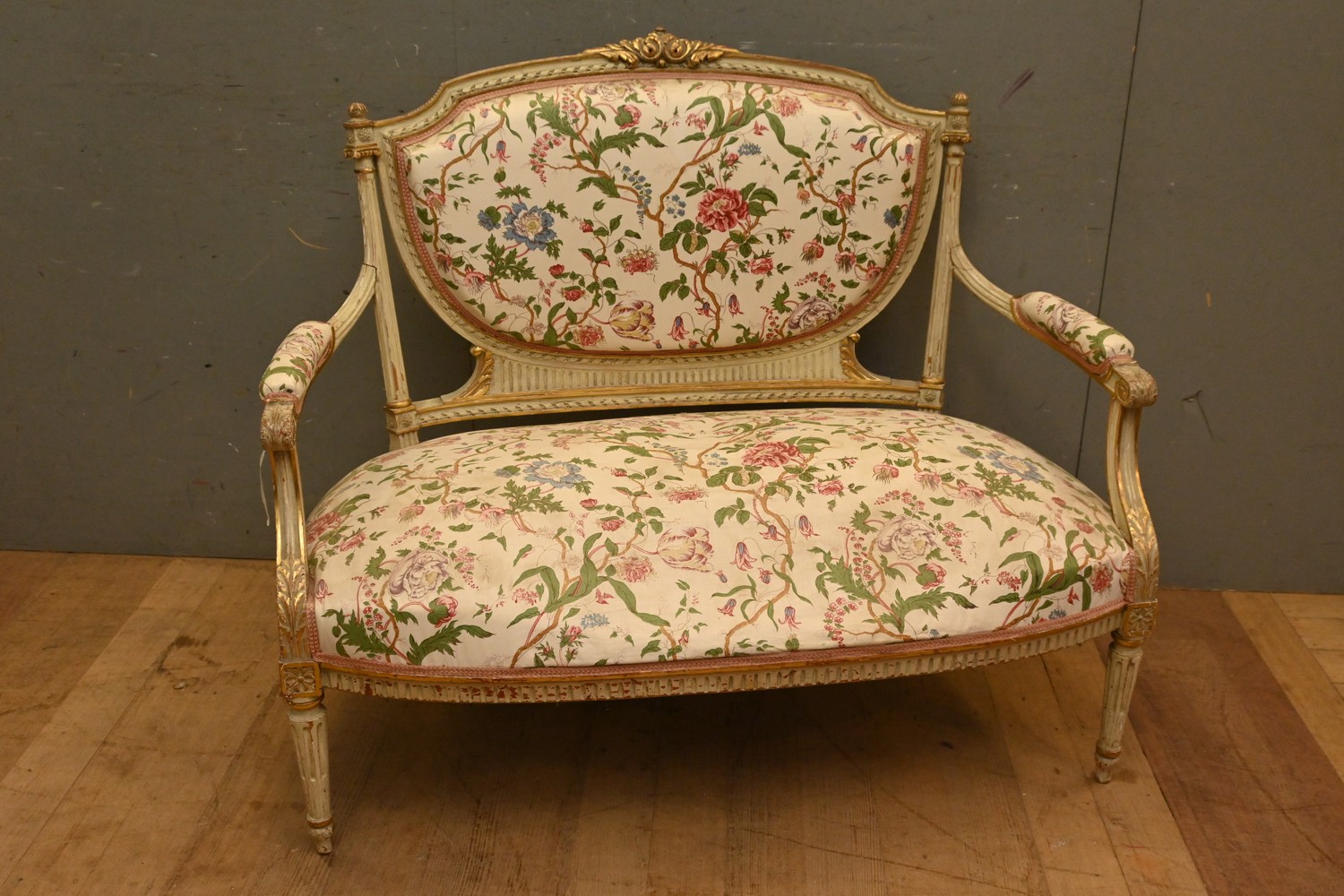 A LOUIS XVI STYLE FLORAL UPHOLSTERED SETTEE (A/F) ( 102H X 122W X 76D CM) (LEONARD JOEL DELIVERY SIZE:X- LARGE)