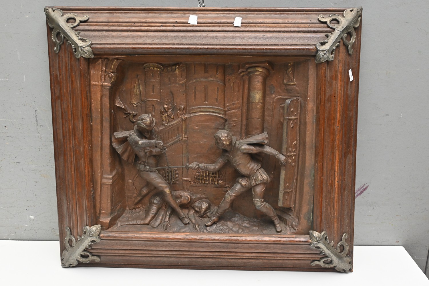 A DECORATIVE PRESSED BRASS WALL HANGING IN OAK FRAME (A/F) ( 53H X 61W X 9D CM) (LEONARD JOEL DELIVERY SIZE: MEDIUM)