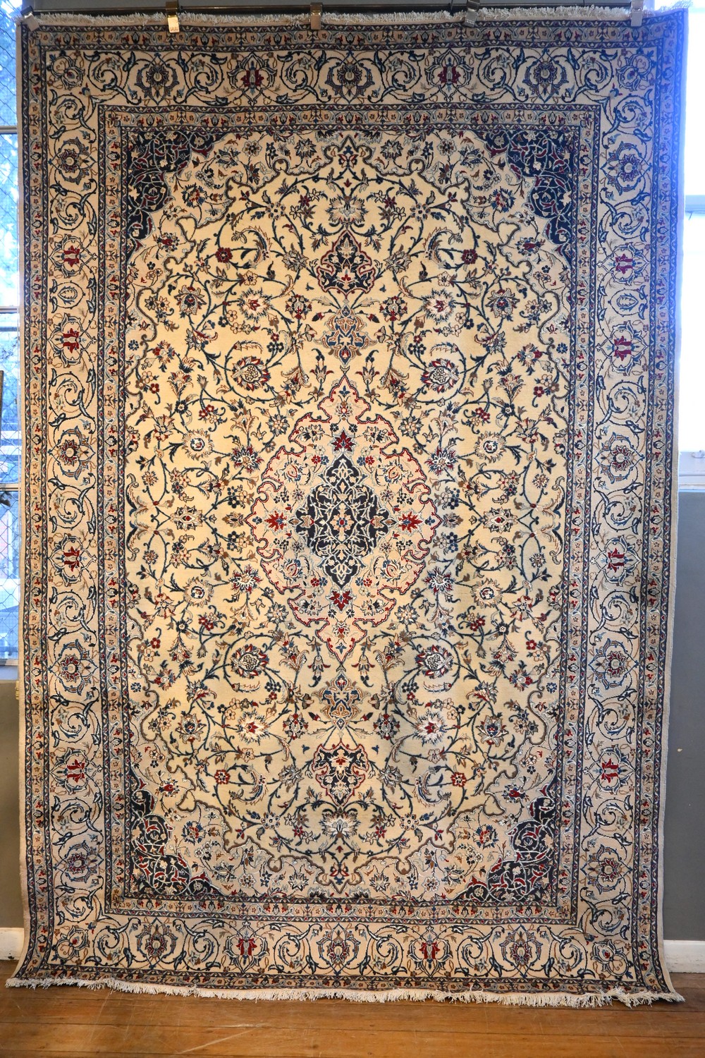 A STUNNING FINELY HAND-KNOTTED PERSIAN NAIEN CARPET. FINE LAMB'S WOOL PILE HEAVILY INTER KNOTTED WITH SILK. SUPERFINE WEAVE CLASSIC NAIEN DESIGN OF CENTRAL MEDALLION AND QUARTERED CORNER MEDALLIONS IN A CREAM FIELD OF PALMETTES, BLOSSOMING FLORAL SPRAYS & SAZ LEAVES IN TONES OF COGNAC, SOFT BURGUNDY, AND ROYAL BLUE. BORDER OF PALMETTES & FLORAL SPRAYS. SIZE: 327 X 220 CM ORIGIN: PERSIA - RRP: $7,900 DOCUMENTATION OF AUTHENTICITY INCLUDED.