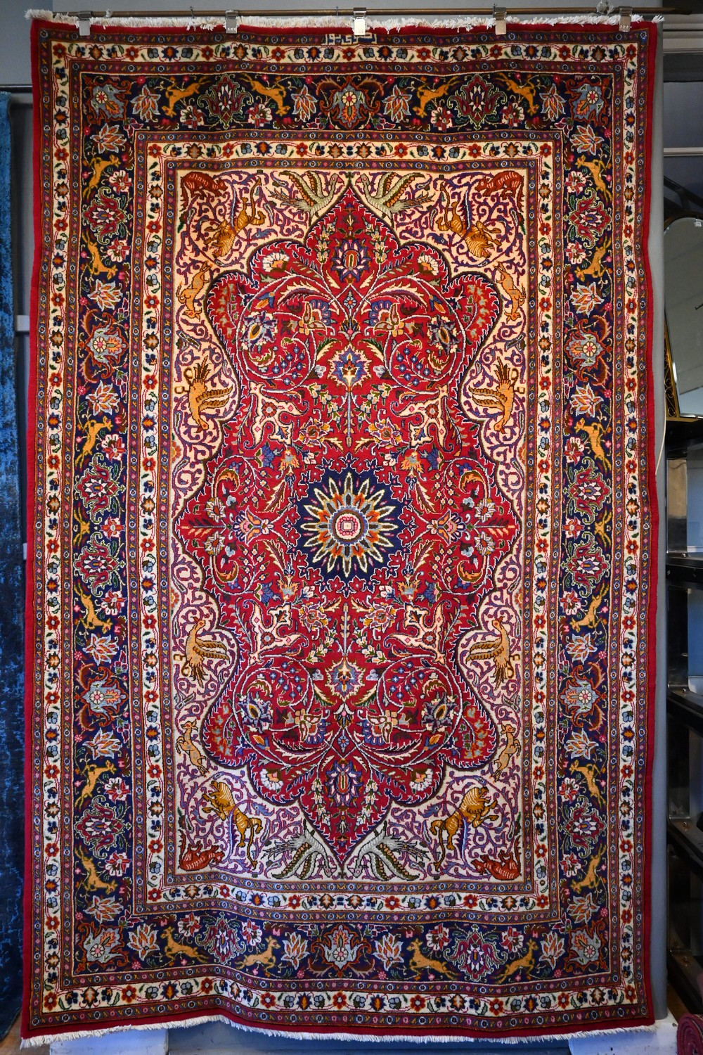 A MOST UNUSUAL PERSIAN SOLID WEAVE MASHAD RUG, FROM THE KHORASAN PROVINCE 100% WOOL PILE AND HARD-WEARING. SUNBURST MEDALLION ON AN OVER FLORAL DESIGN OF ESLIMI ARABESQUE SCROLLS AND TENDRILS ON A DEEP RED FIELD WITH BIRD OF PHOENIX, DEER AND LIONS HIGHLIGHTED IN GOLD. BORDER OF PALMETTES ON A ROYAL BLUE FIELD. SIGNED PIECE. ORIGIN: IRAN - RRP: $5,900, SIZE: 305 X 194 CM DOCUMENTATION OF AUTHENTICITY INCLUDED.