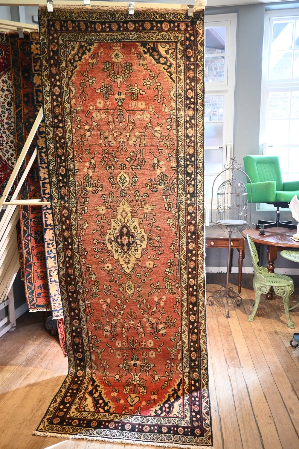 A PERSIAN MEHRABAN HALL RUNNER, 100% WOOL. DENSE PILE. STURDY & HARD-WEARING. FINELY HAND-KNOTTED VILLAGE WEAVE WITH TRADITIONAL DESIGN OF CENTRAL FLORAL MEDALLION & CORNER MEDALLIONS IN A SOFT RED FIELD OF FLORAL SPRAYS & TENDRILS. FLORA AND TRIBAL-PATTERNED BORDER. SIZE: 300 X 106 CM ORIGIN: PERSIA - RRP: $1,900 DOCUMENTATION OF AUTHENTICITY INCLUDED