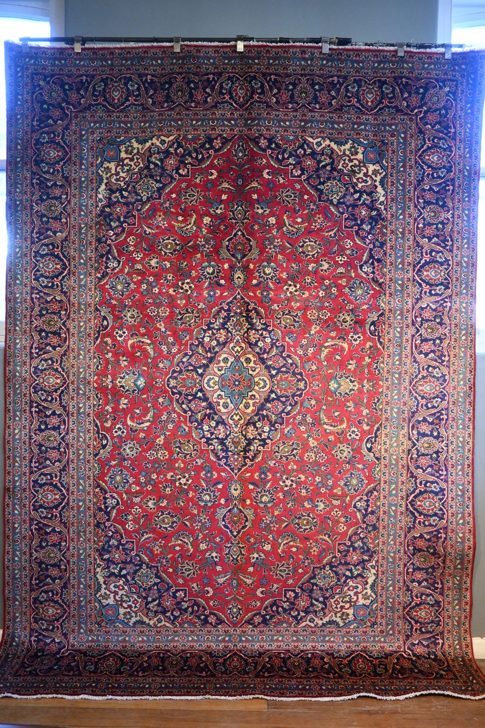 A VERY FINE PERSIAN TABRIZ RUG WITH CENTRAL MEDALLION ON A BLUE FIELD IN RED BORDER (396 X 303 CM) (PLEASE NOTE THIS HEAVY ITEM MUST...