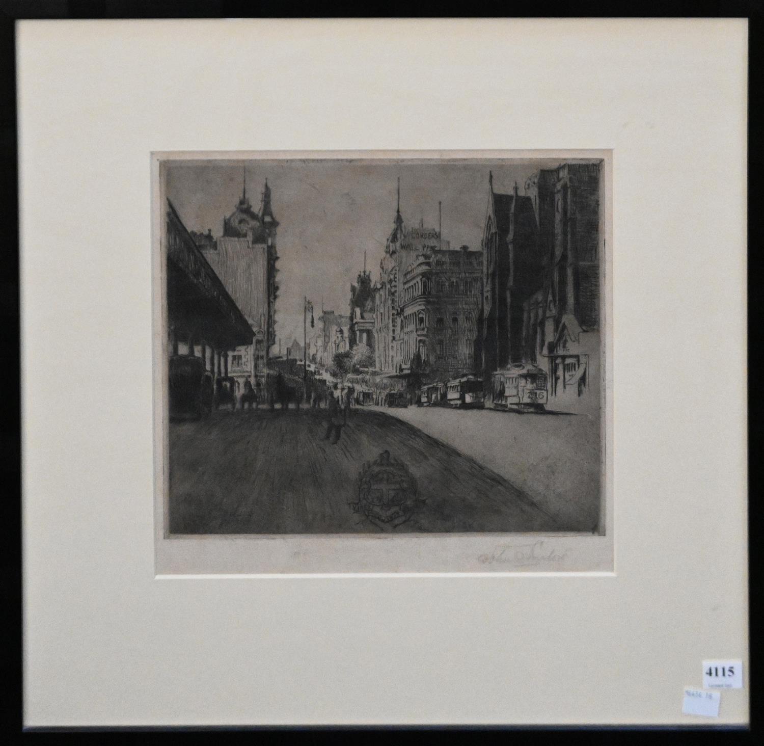 JOHN SHIRLOW, MELBOURNE FROM THE SOUTHBANK OF THE YARRA, ETCHING, SIGNED LOWER RIGHT, 21 X 23CM, FRAMED: 37 X 39CM