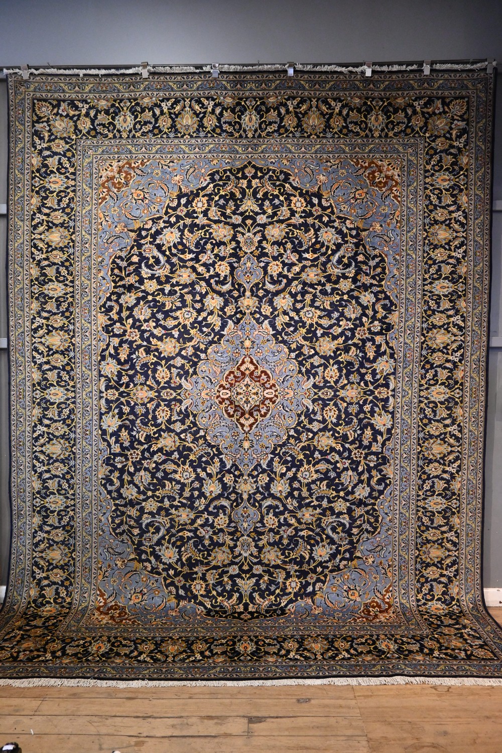 PERSIAN ROYAL KASHAN. 100% WOOL. SOLID & DENSE PILE. FINELY HAND-KNOTTED KASHAN DESIGN OF BOLD FLORAL MEDALLION OF PALMETTES SET WITHIN A ROYAL BLUE FIELD OF 16TH CENTURY SHAH ABBASI PALMETTES, BOLD FLOWER HEADS & SAZ LEAVES IN TONES OF FRENCH BLUE AND COGNAC. MAJOR BORDER OF PALMETTES & SAZ LEAVES. MINOR BORDERS OF PALMETTES & FLOWER HEADS. EX-GALLERY EXHIBITED. IN SUPERB CONDITION SIZE: 380 X 282 CM - RRP: $8,900 DOCUMENTATION OF AUTHENTICITY INCLUDED