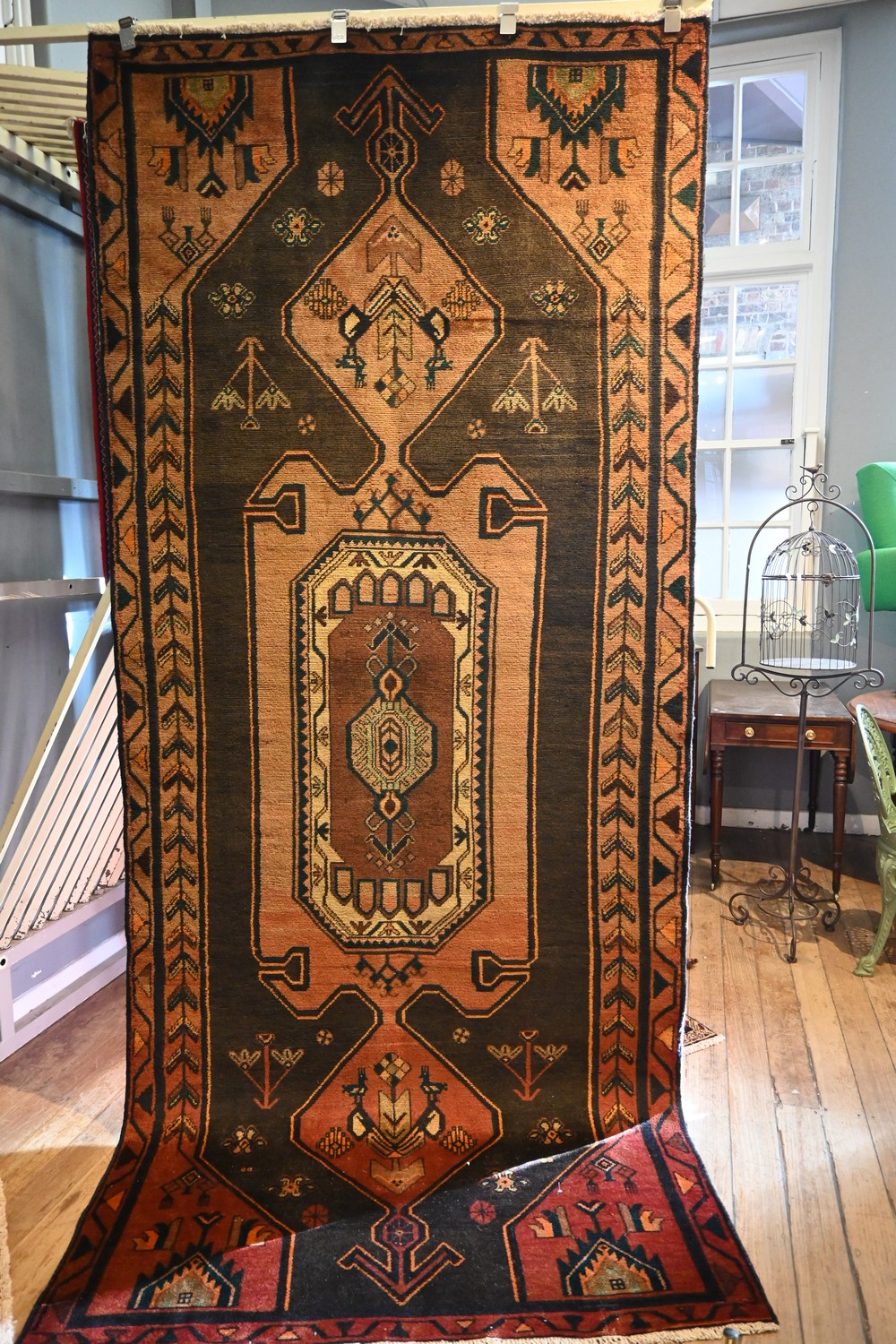 A SOLID CIRCA 1970'S KAKABERU PERSIAN RUG. 100% WOOL, ORGANIC DYES, VINTAGE PILE. WOVEN BY KURDISH NOMADS FROM NORTHWEST IRAN. CENTRAL ANCHORED MEDALLION CONTAINING TRIBAL & ANIMAL MOTIFS ON A CHARCOAL FIELD OF TREE OF LIFE AND MINI ROSETTE MOTIFS. CORNER MEDALLIONS CONTAINING TRIBAL TREE OF LIFE DESIGNS ON BOTH SIDES OF BORDER. SIZE: 307 X 136 CM -ORIGIN: PERSIA - RRP: $3,100 DOCUMENTATION OF AUTHENTICITY INCLUDED.