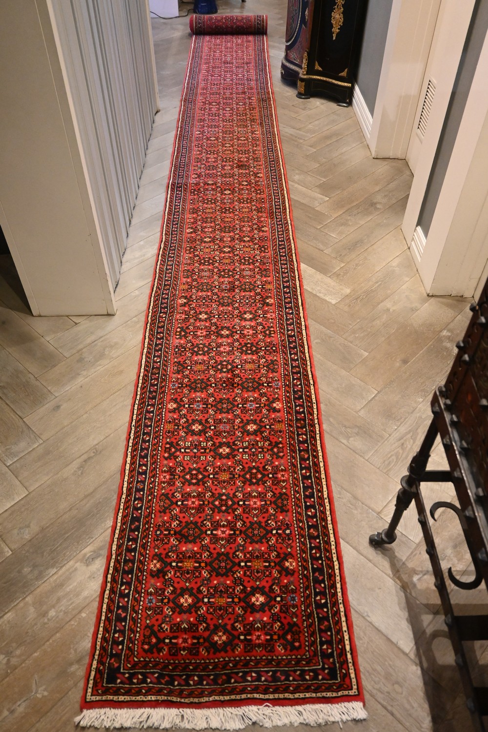 AN EXTRA LONG NARROW HARD TO COME BY PERSIAN HOSSAINABAD HALL RUNNER. 100% PLUSH WOOL PILE. SOLID & HARD-WEARING. VILLAGE WEAVE FROM THE HAMADAN REGION WITH TRADITIONAL DESIGN OF ALL-OVER FLORAL HERATI MAHI PATTERNS IN A SOFT RED FIELD. BORDER OF FLORAL MOTIFS. WITH TONES OF CREAM, CHARCOAL AND A TOUCH OF GREEN. IN EXCELLENT CONDITION. SIZE: 813 X 75 CM ORIGIN: PERSIA - RRP: $5,500 DOCUMENTATION OF AUTHENTICITY INCLUDED.