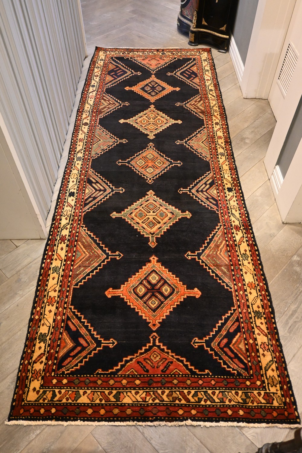 A FABULOUS HARD-WEARING HAND-KNOTTED PERSIAN TRIBAL ZAGEH RUNNER. CONTINUING DIAMOND SHAPED MEDALLIONS IN AN OPEN DEEP RICH NAVY FIELD. BORDER OF TRIBAL MOTIFS. 100% WOOL & NATURAL DYES. PLUSH SOLID PILE. ZAGEH RUGS ARE RENOWNED FOR THEIR DURABILITY FOR HIGH TRAFFIC AREAS. SIZE: 346 X 126 CM- RRP $3,600- ORIGIN: PERSIA DOCUMENTATION OF AUTHENTICITY INCLUDED.