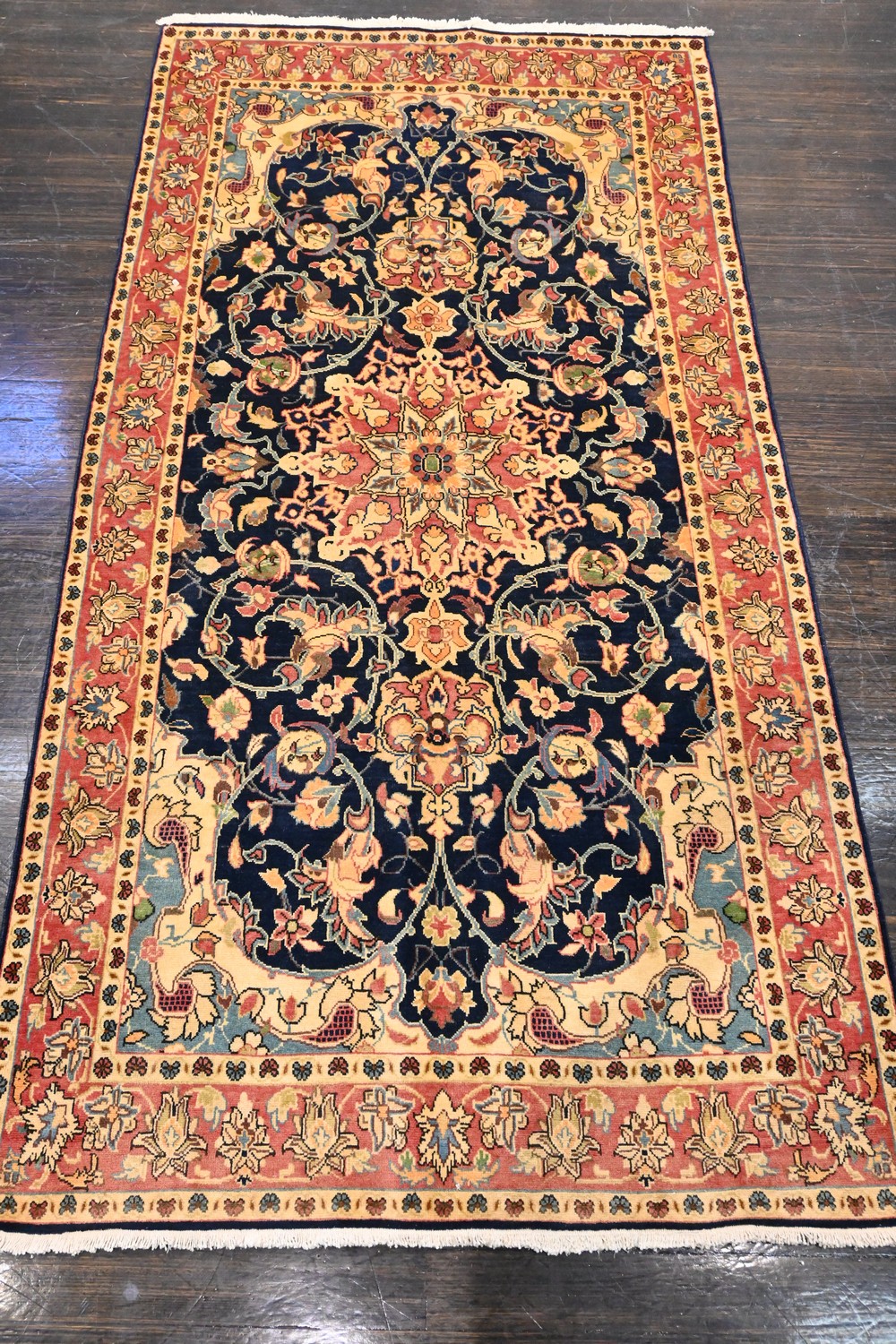A CIRCA 1970'S PERSIAN SAROUQ MAHAL CARPET, 100% WOOL. CLASSIC DESIGN OF A CENTRAL FLORAL MEDALLION ON A NAVY-BLUE FIELD OF ALL OVER FLORAL SPRAYS AND PALMETTES IN REDS AND BLUES. BORDER OF PALMETTES AND FLORAL PATTERNS ON A RUST TONE FIELD. SIZE: 305 X 156 CM ORIGIN: IRAN - RRP: $2,600 DOCUMENTATION OF AUTHENTICITY INCLUDED.