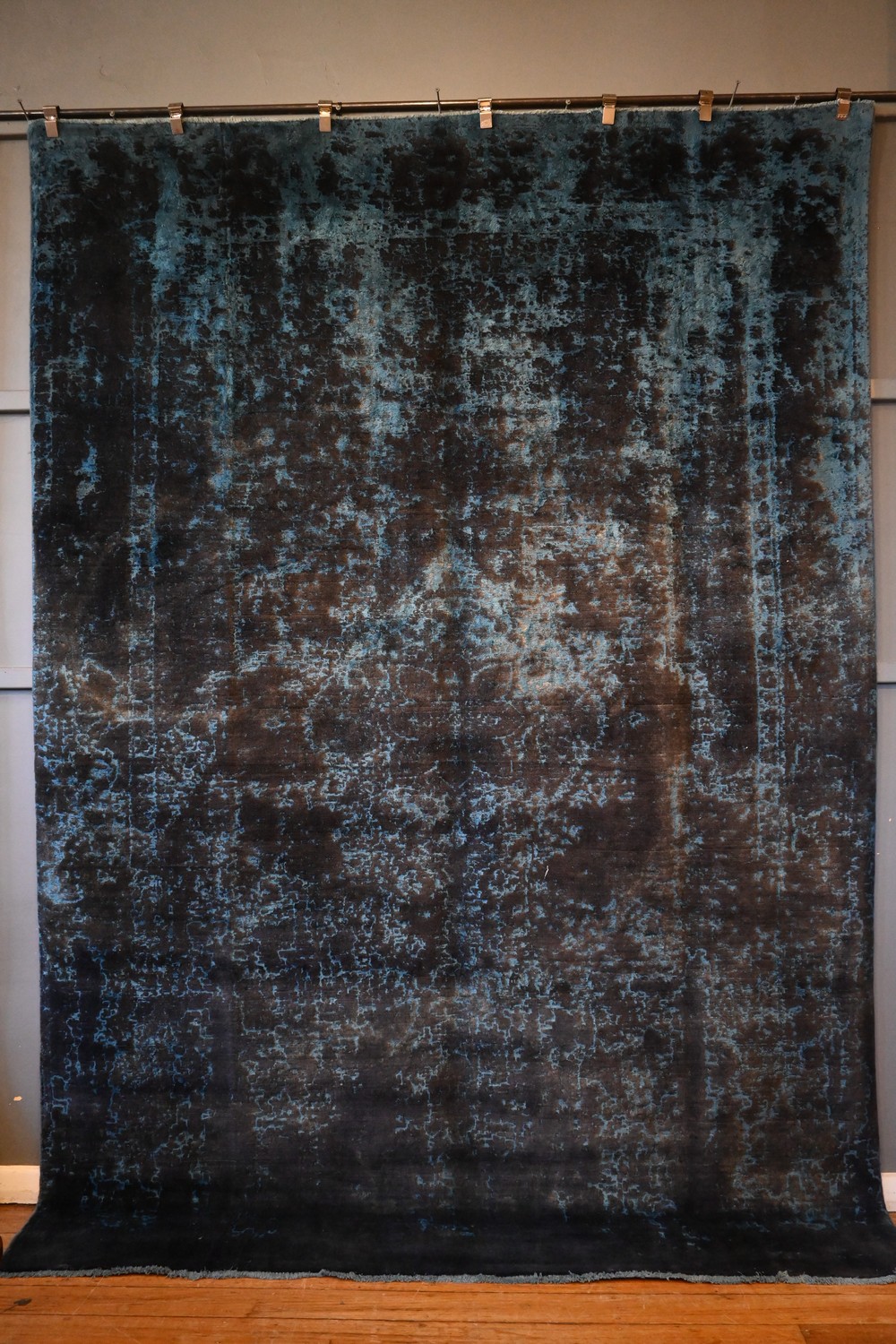 A BEAUTIFUL MODERN TRANSITIONAL PERSIAN KERMAN DESIGNER RUG. FINELY HAND WOVEN IN IRAN. 100 % WOOL PLUSH PILE WITH A TOUCH OF TENCEL SILK. CENTRAL ELONGATED MEDALLION. IN TONES OF CHARCOAL AND BLUE. SIZE: 339 X 243 CM ORIGIN: PERSIA - RRP: $6,900 DOCUMENTATION OF AUTHENTICITY INCLUDED.