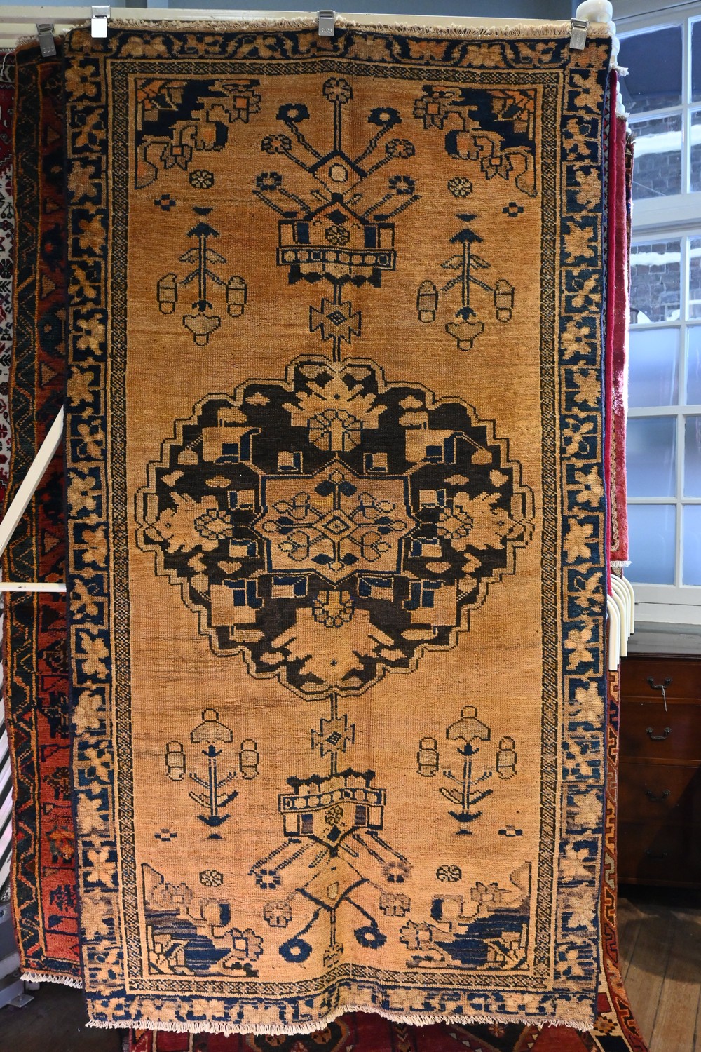 A CIRCA 1960'S TRIBAL PERSIAN LURI RUG, 100% WOOL, NATURAL DYES, VINTAGE PILE. TRIBAL WEAVE & DESIGN OF A CENTRAL ELONGATED GEOMETRIC MEDALLION WITH A TREE OF LIFE DESIGN ON A SOFT TONED FIELD. BORDER OF TRIBAL PATTERNS. SOME RESTORATION. SIZE: 217 X 115 CM- ORIGIN: IRAN - RRP: $2,200 DOCUMENTATION OF AUTHENTICITY INCLUDED.