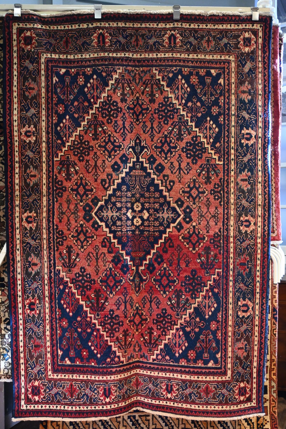 A CIRCA 1970'S PERSIAN JOSHAGAN RUG. 100% WOOL. TRADITIONAL DESIGN OF DIAMOND-SHAPED MEDALLION & CORNER MEDALLIONS IN ROYAL BLUE IN A FIELD OF DIAGONAL ROWS OF SNOWFLAKES ON A CRIMSON FIELD. SOME NATURAL ABRASH. SIZE: 207 X 138 CM- ORIGIN: PERSIA - RRP: $2,100 DOCUMENTATION OF AUTHENTICITY INCLUDED.