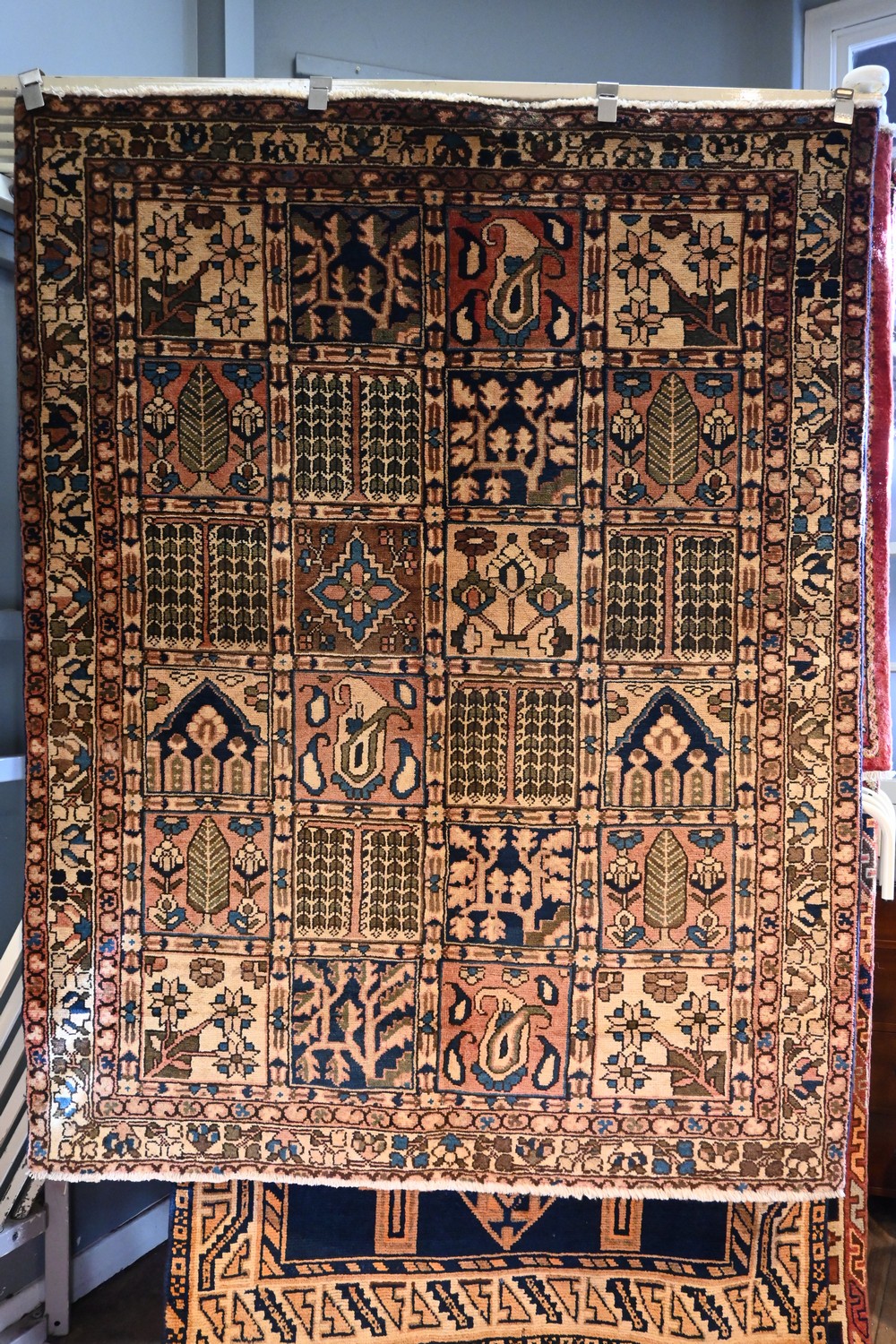 A TRIBAL VINTAGE PERSIAN BAKHTIAR RUG. 100% WOOL. VINTAGE PILE, HAND-KNOTTED TRIBAL BAKHTIARI WEAVE WITH TRADITIONAL "GARDEN" DESIGN WITH PANELS CONTAINING GARDEN THEMES OF WILLOW TREES, FLORAL SHRUBS, PALMETTES AND PRAYER NICHES. BORDER OF PALMETTES & TENDRILS. SOME RESTORATION. SIZE: 190 X 150 CM ORIGIN: PERSIA - RRP: $1,900 DOCUMENTATION OF AUTHENTICITY INCLUDED.