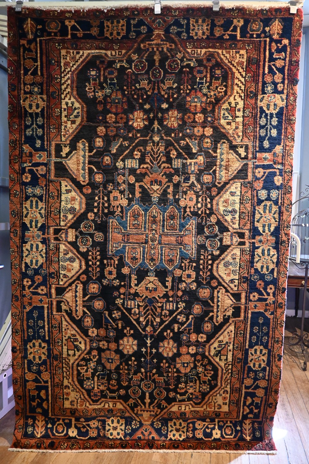 AN EXTREMELY INTRICATE DESIGN PERSIAN NAHAVAND RUG. 100% SOLID WOOL. NATURAL DYES. FINELY HAND-KNOTTED VILLAGE WEAVE WITH A DESIGN OF BOLD STYLIZED ANCHORED MEDALLION SET WITHIN A FIELD OF VARYING FLORAL & "TREE OF LIFE" PATTERNS AND ANIMAL MOTIFS ON A CHARCOAL FIELD. BORDER OF FLORAL SHRUBS & ANIMAL PATTERNS. SIZE: 255 X 160 CM ORIGIN: PERSIA - RRP: $2,900 DOCUMENTATION OF AUTHENTICITY INCLUDED