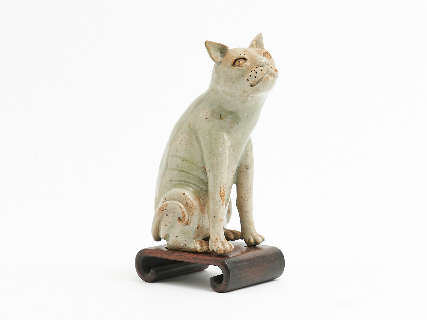 A JAPANESE POTTERY CAT ON WOODEN STAND (A/F) H.16CM, LEONARD JOEL LOCAL DELIVERY: SMALL