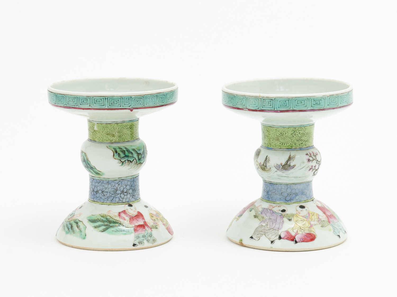A PAIR OF CHINESE FAMILLE ROSE PORCELAIN CANDLESTICKS H.13CM, LEONARD JOEL LOCAL DELIVERY: SMALL
