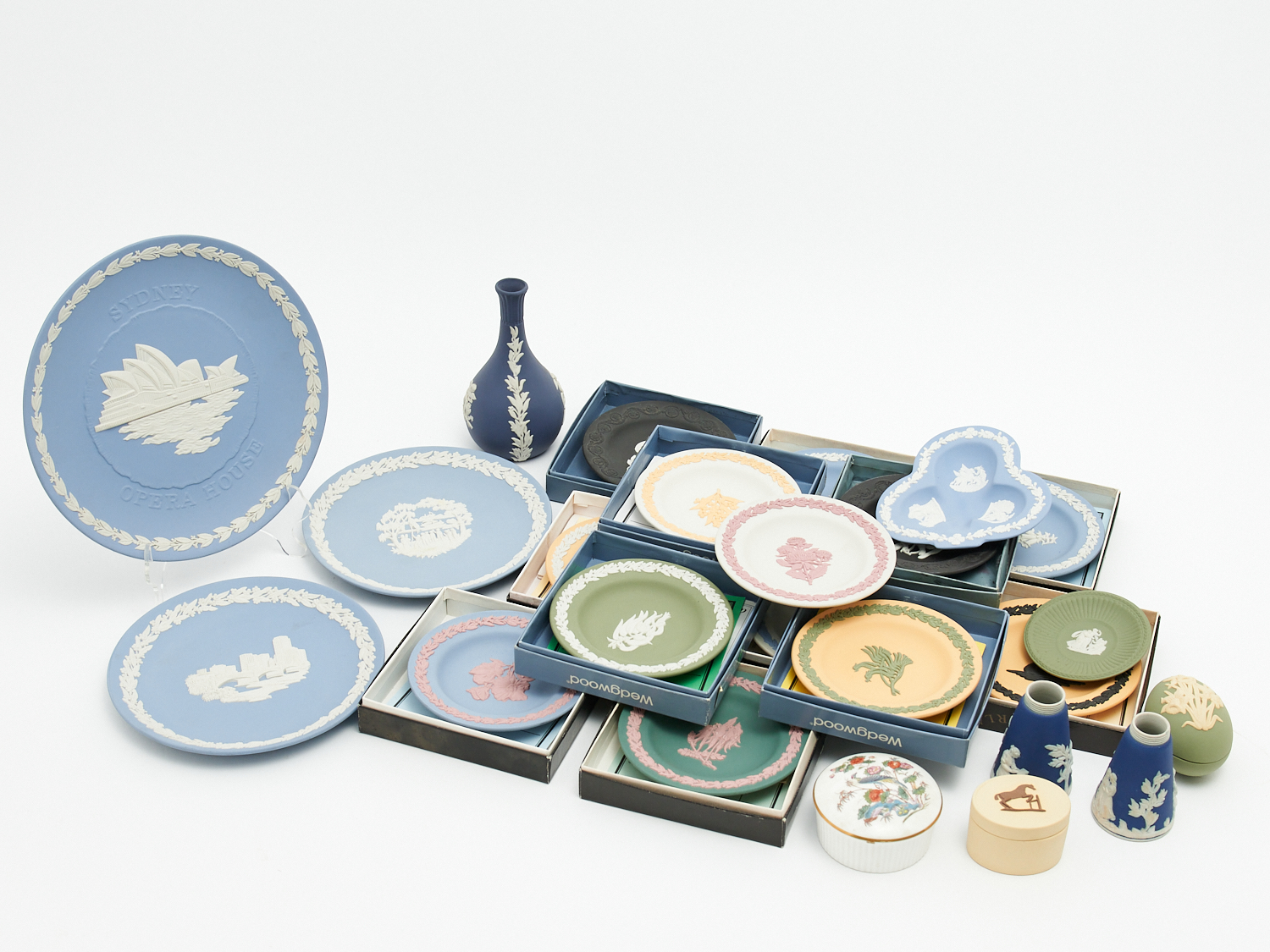 A GROUP OF ASSORTED MODERN WEDGWOOD JASPERWARE: PLATES, DISHES AND VASE, LEONARD JOEL LOCAL DELIVERY: MEDIUM