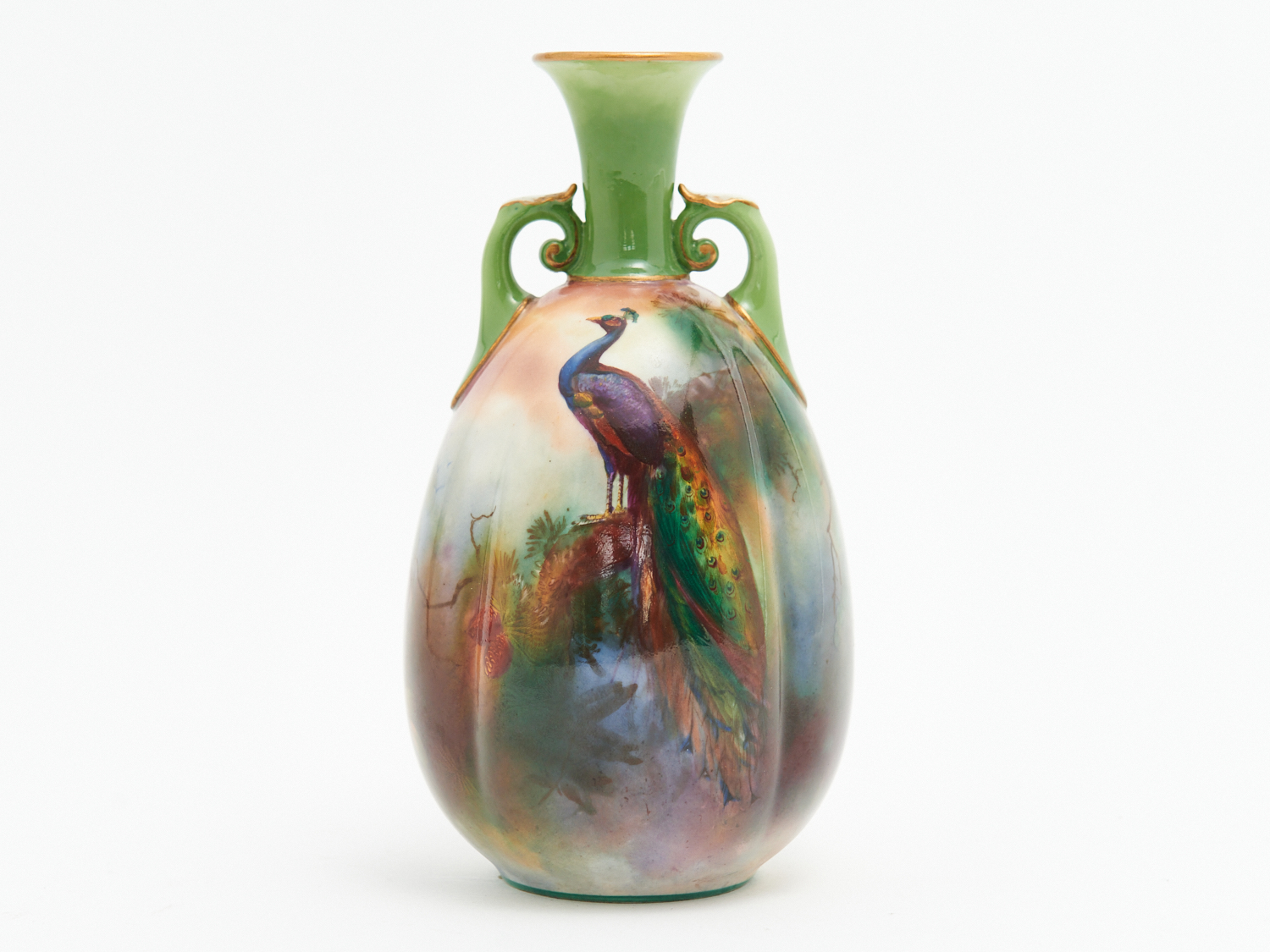 A ROYAL WORCESTER VASE WITH PEACOCK DECORATION, SIGNED AUSTIN H.16CM, LEONARD JOEL LOCAL DELIVERY: SMALL