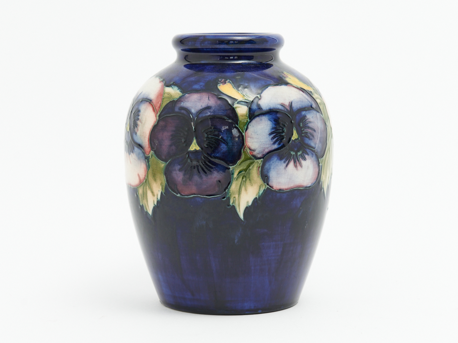 A MOORCROFT PANSY PATTERN VASE H.16CM, LEONARD JOEL LOCAL DELIVERY: SMALL