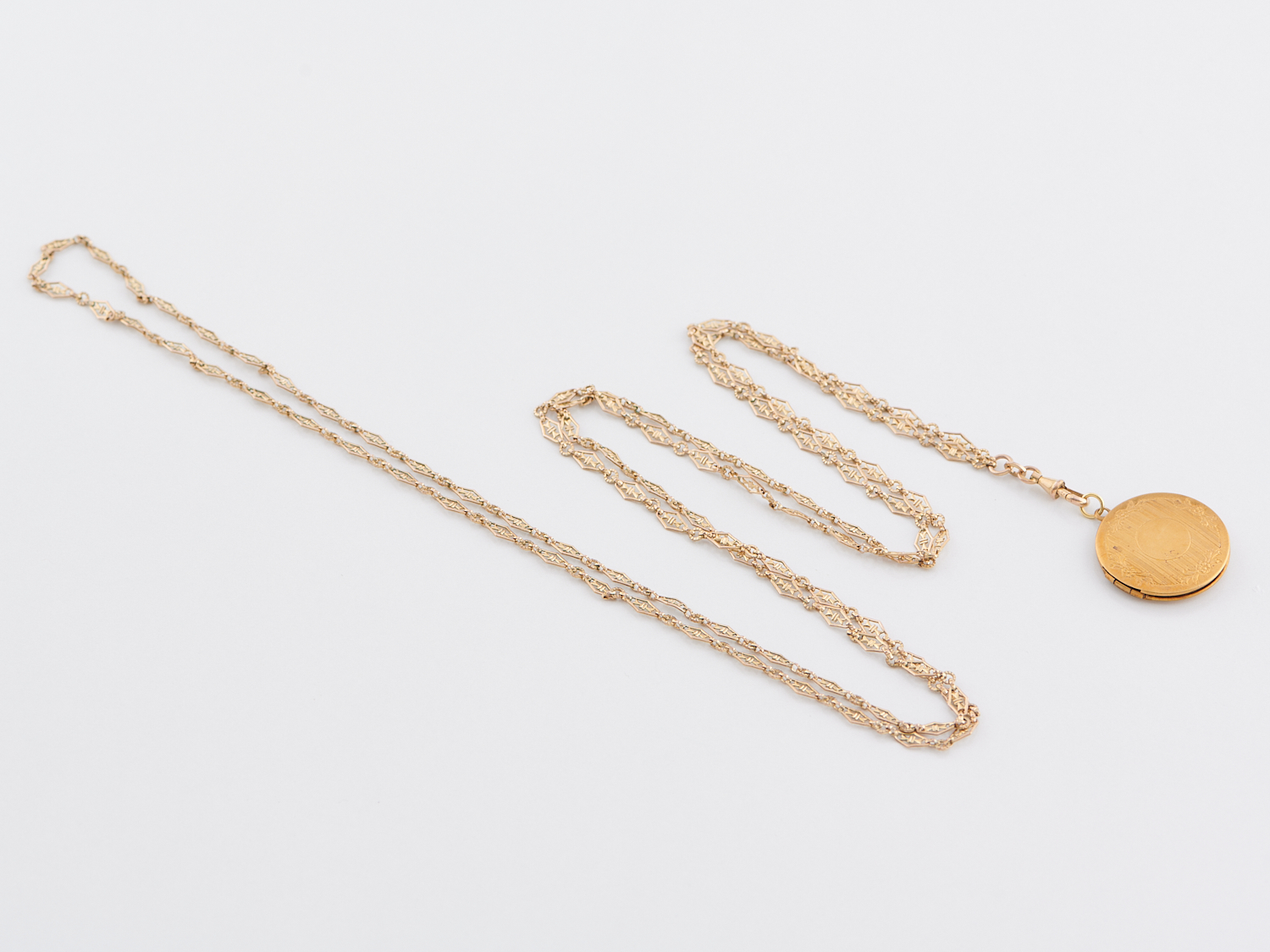 A FRENCH GOLD PLATED FANCY LINK GUARD CHAIN, LENGTH 1405MM, TO A GOLD PLATED LOCKET, DIAMETER 30MM