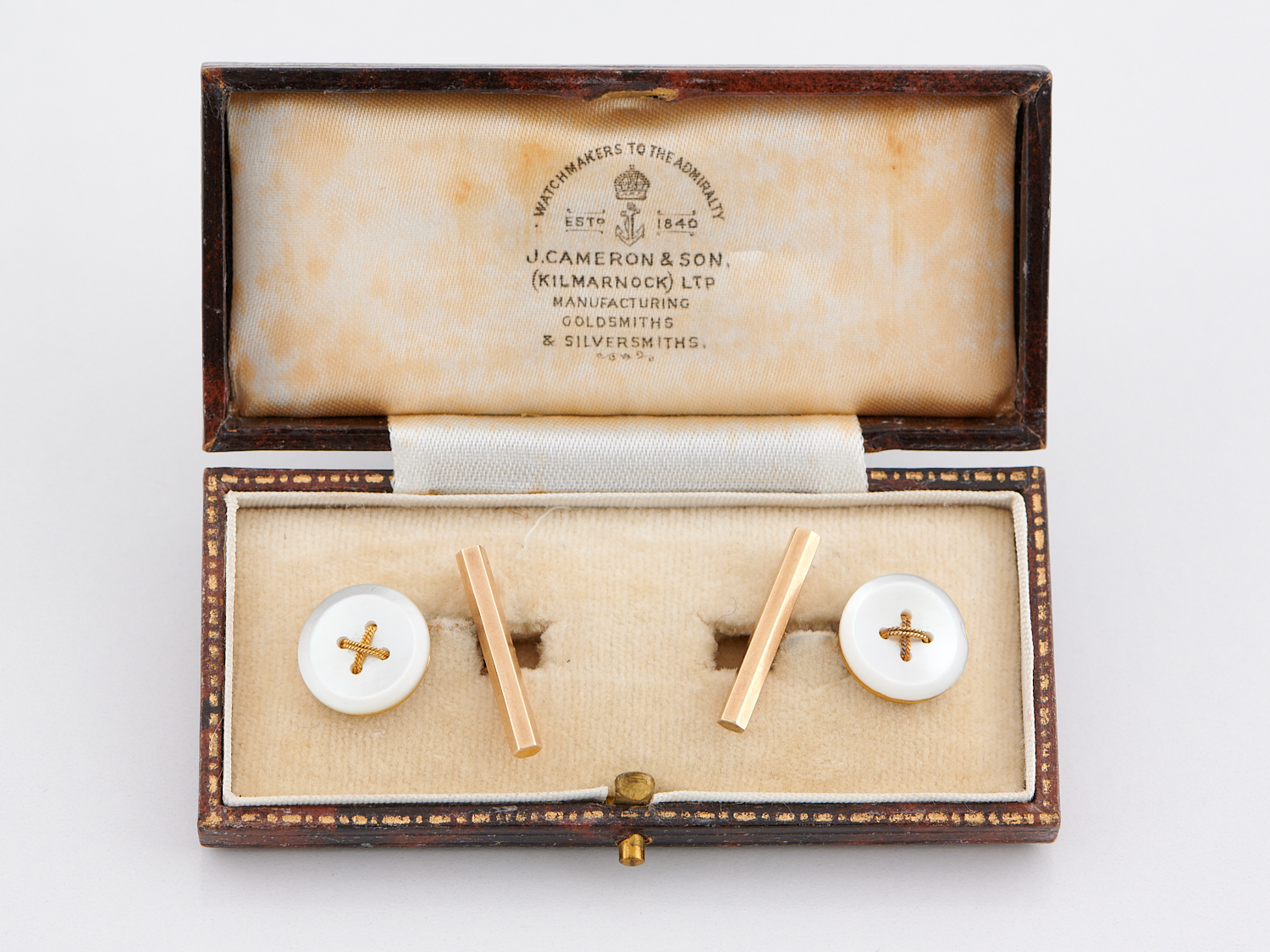 A PAIR OF ANTIQUE MOTHER OF PEARL CUFFLINKS IN 9CT GOLD, BOXED