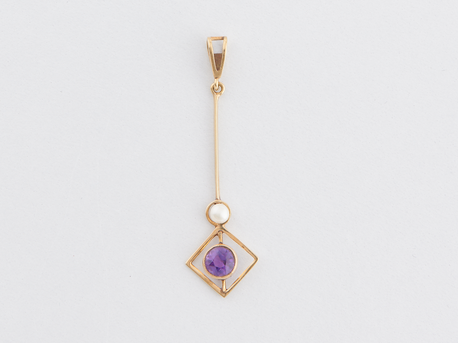 AN ANTIQUE AMETHYST AND PEARL PENDANT IN 14CT GOLD, LENGTH 40MM, 0.8GMS