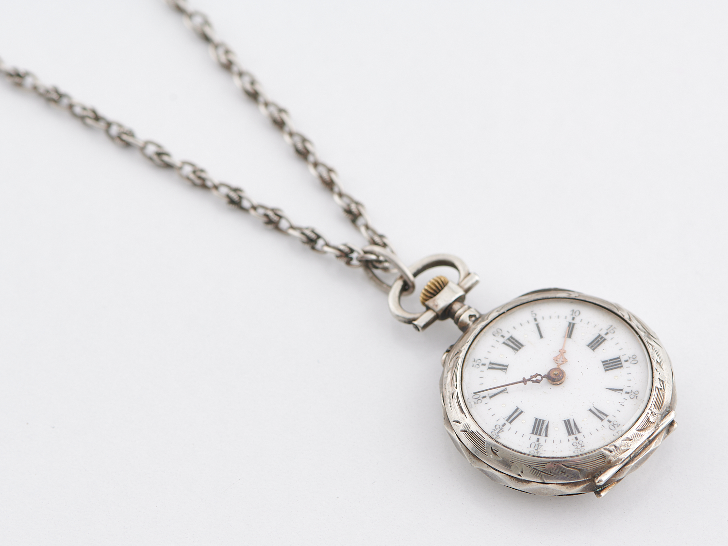 A CONTINENTAL SILVER FOB WATCH WITH GOLD INLAY DETAIL, TO A FANCY STERLING SILVER CHAIN, LENGTH 700MM, TOTAL WEIGHT 37.8GMS