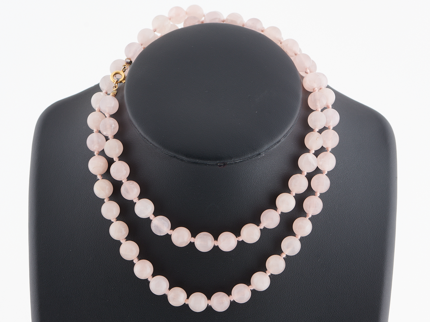 A STRAND OF INDIVIDUALLY KNOTTED ROSE QUARTZ BEADS TO GOLD PLATED CLASP, STONE DIAMETER 9MM, LENGTH 750MM