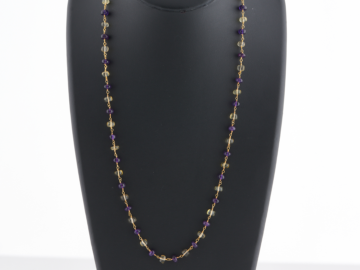 AN AMETHYST AND LEMON QUARTZ BEAD NECKLACE IN SILVER GILT, TO A GOLD PLATED CLASP, LENGTH 60MM