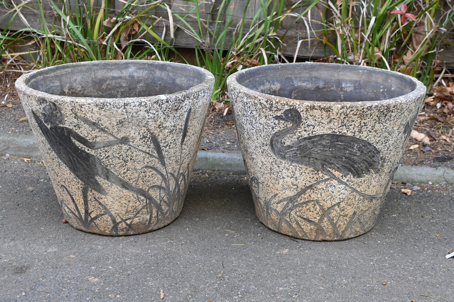 PAIR OF 1950S AUSTRALIAN ENGRAVED CONCRETE PLANTERS (A/F) ( 36H X 46 DIAMETER CM) (PLEASE NOTE THIS HEAVY ITEM MUST BE REMOVED BY CLIENTS OR CARRIERS AT THE CUSTOMERS EXPENSE. LEONARD JOEL STAFF CANNOT ASSIST CARRYING THIS ITEM)
