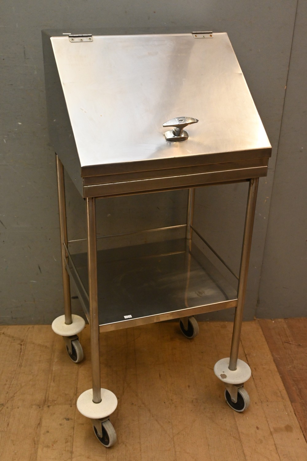 AN UNUSUAL 1950S STAINLESS STEEL HOSPITAL TROLLEY WITH LOCKABLE LIFT OFF COMPARTMENT (A/F) ( 119H X 53W X 47D CM) (LEONARD JOEL DELIVERY SIZE: LARGE)