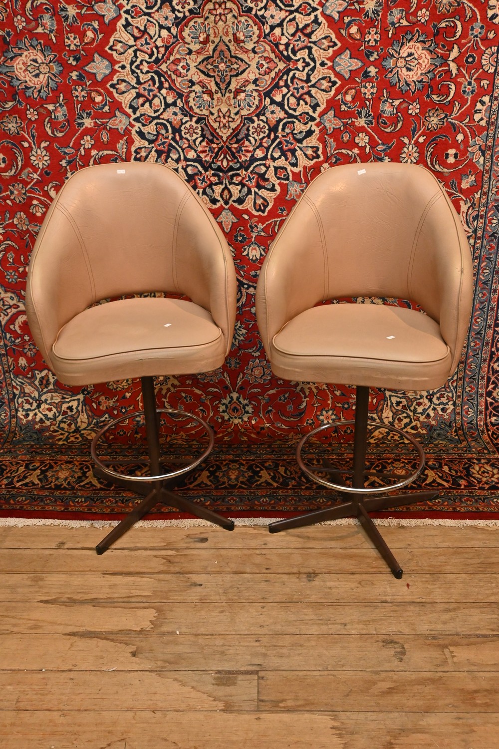 A PAIR OF AUSTRALIAN RETRO STEEL BASED SWIVEL BARSTOOLS (A/F) ( 105H X 55W X 48D CM) (LEONARD JOEL DELIVERY SIZE: X-LARGE)
