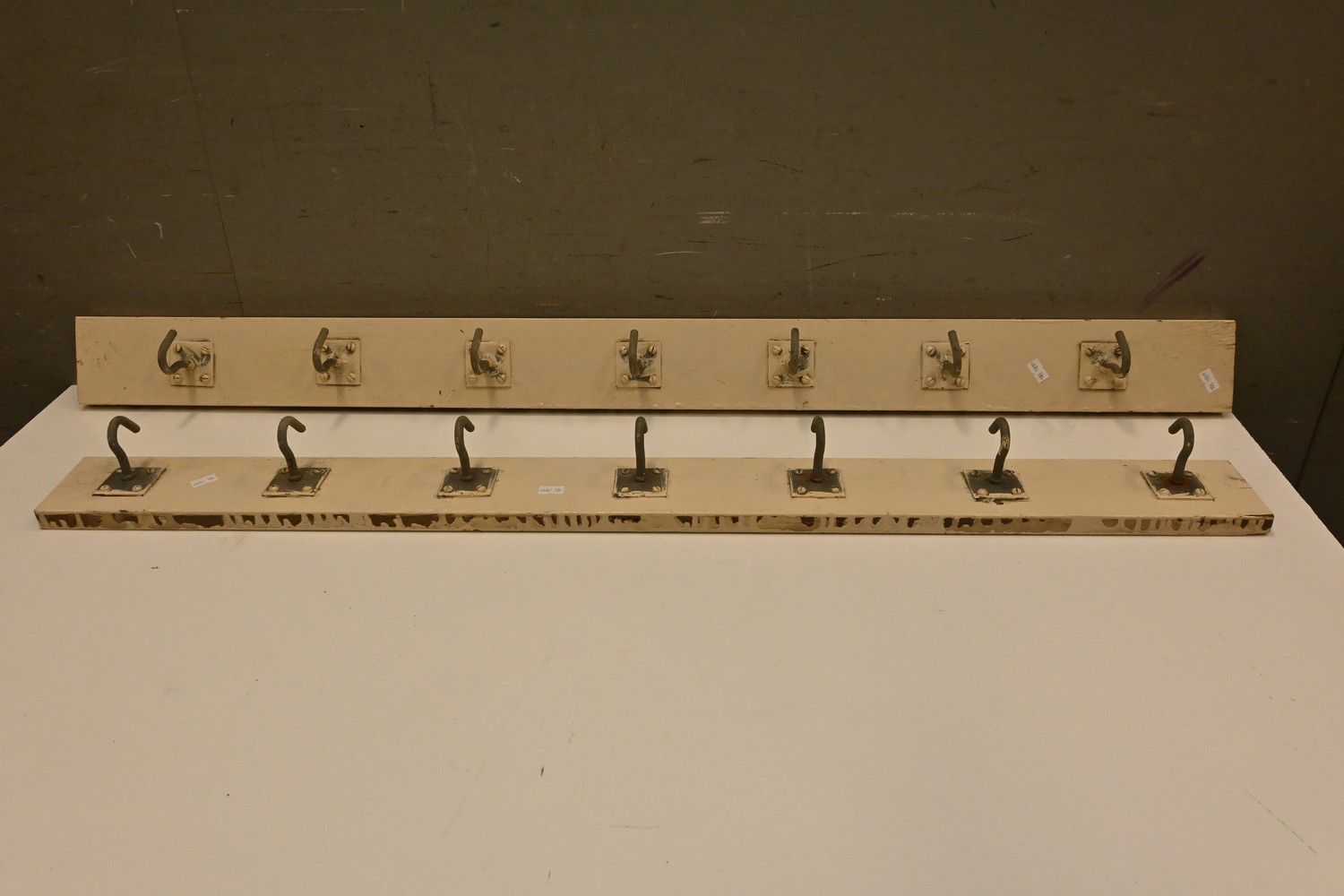 A PAIR OF VINTAGE WOODEN BACK SEVEN HOOK COAT AND HAT RACKS ( A/F) ( 103W CM) (LEONARD JOEL DELIVERY SIZE: MEDIUM)
