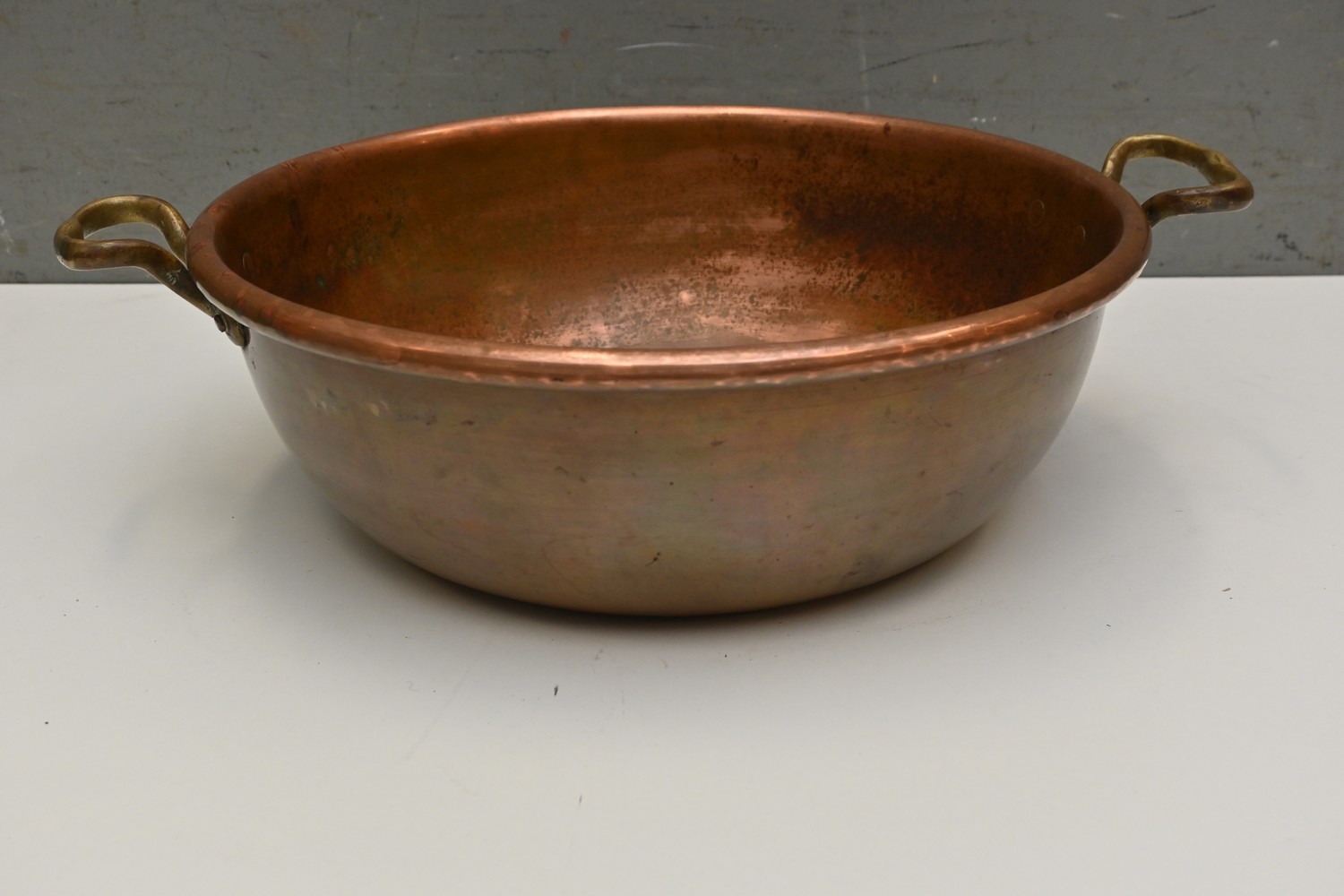 LARGE 19TH-CENTURY FRENCH SOLID COPPER AND TWO BRASS HANDLED PRESERVING POT ( 15H X 55W CM) (LEONARD JOEL DELIVERY SIZE: MEDIUM)