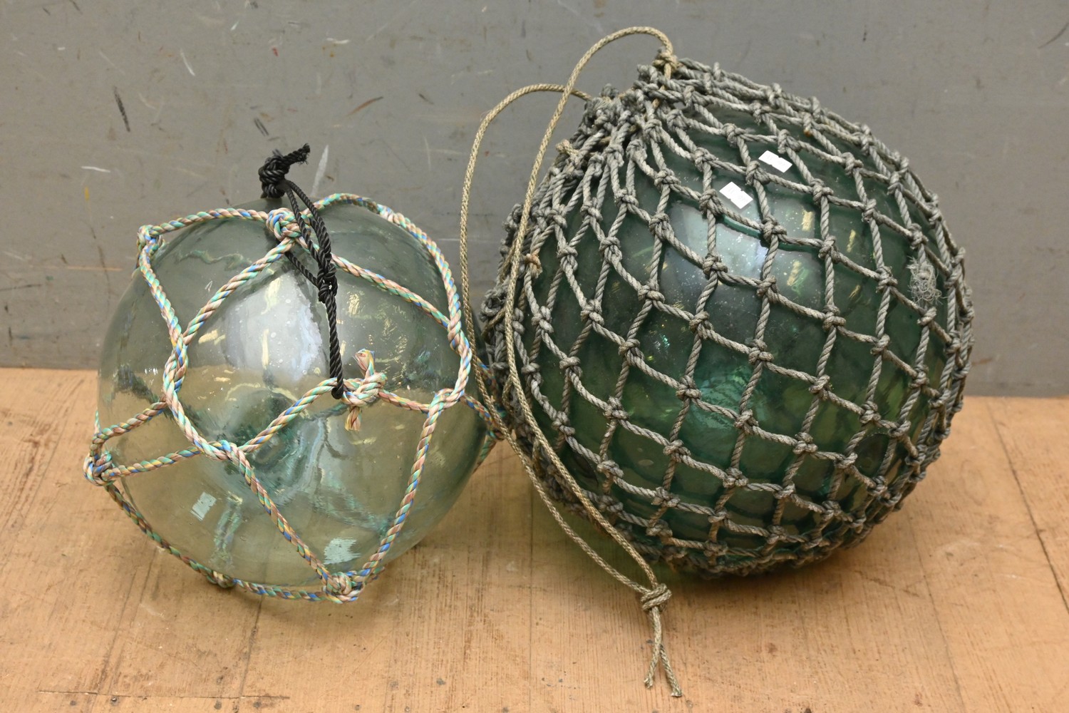 A PAIR OF GREEN GLASS ROPE BOUND SHIP BOY FISHING FLOATS ( 36 DIAMETER CM) (LEONARD JOEL DELIVERY SIZE: LARGE)