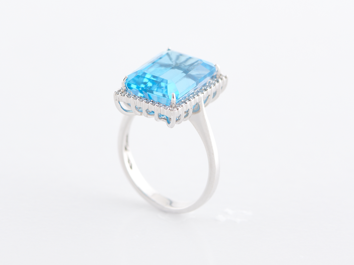 A BLUE TOPAZ AND DIAMOND RING IN 14CT WHITE GOLD, THE TOPAZ TOTALLING 10.35CTS, THE DIAMONDS TOTALLITN 0.22CTS, SIZE M 1/2, 5.95GMS