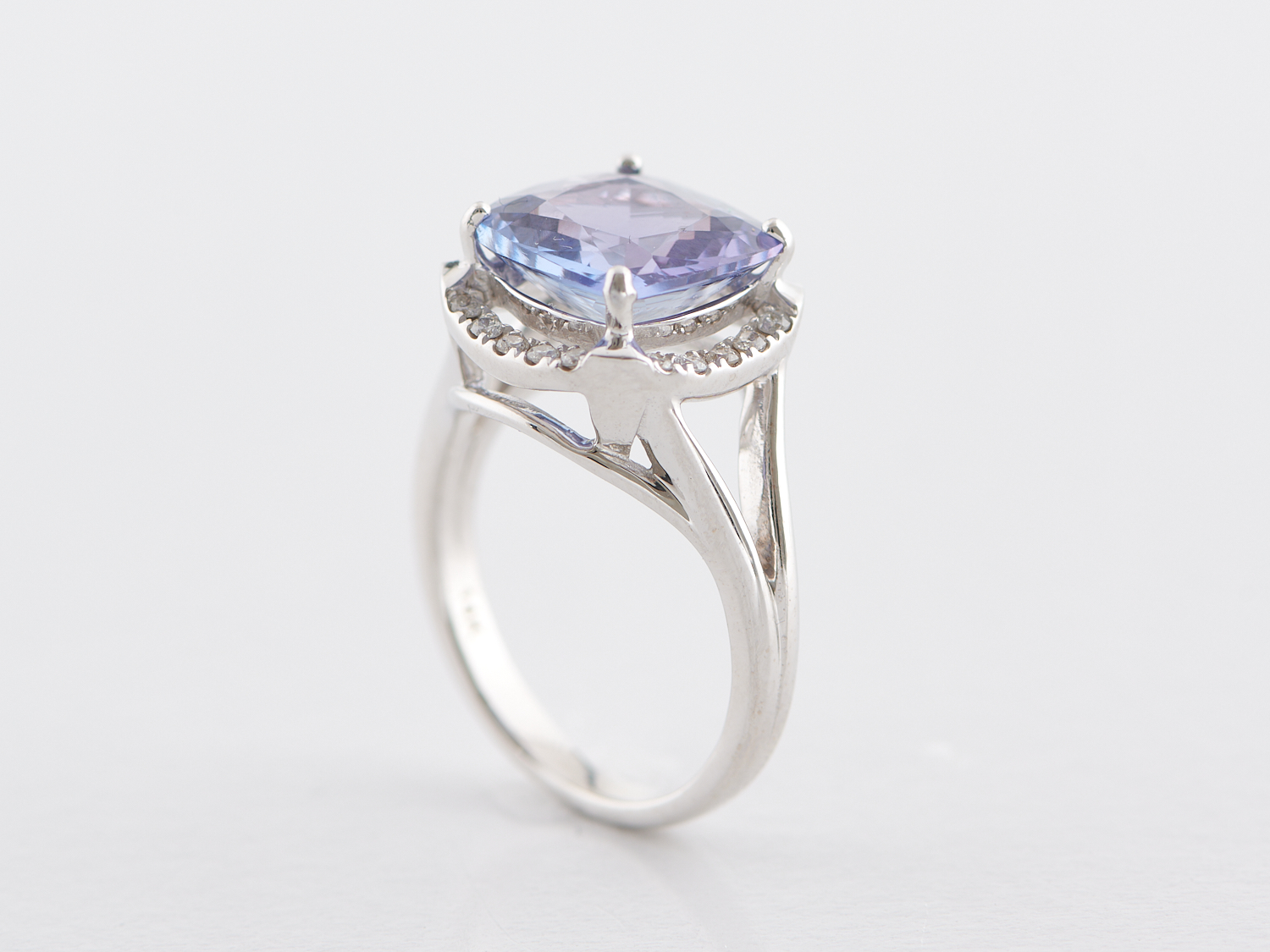 A TANZANITE AND DIAMOND SET RING IN 14CT WHITE GOLD, THE TANZANITE TOTALLING APPROXIMATELY 4.43CTS, THE DIAMONDS TOTALLING APPROXIMATELY 0.20CTS, APPROXIMATE RING SIZE N, APPROXIMATE WEIGHT 6.46GMS.