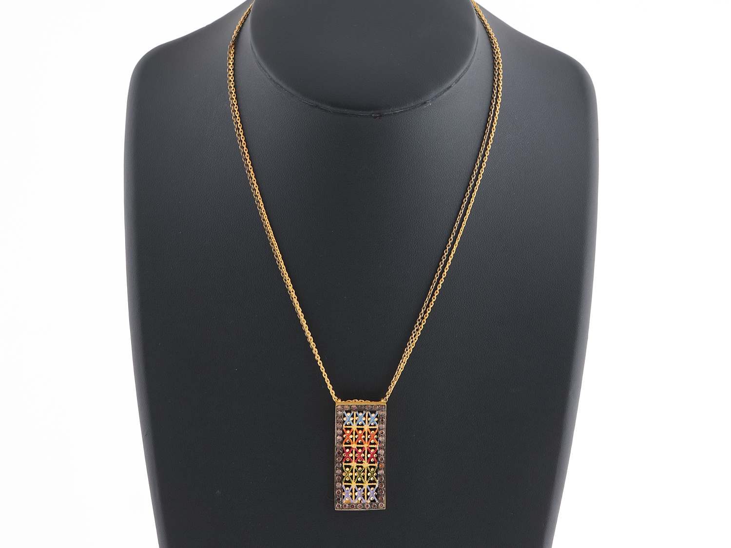 AN ENAMELLED PENDANT AND NECKLACE IN 22CT GOLD, THE PENDANT MEASURING 40 X 18MM, 14.7GMS
